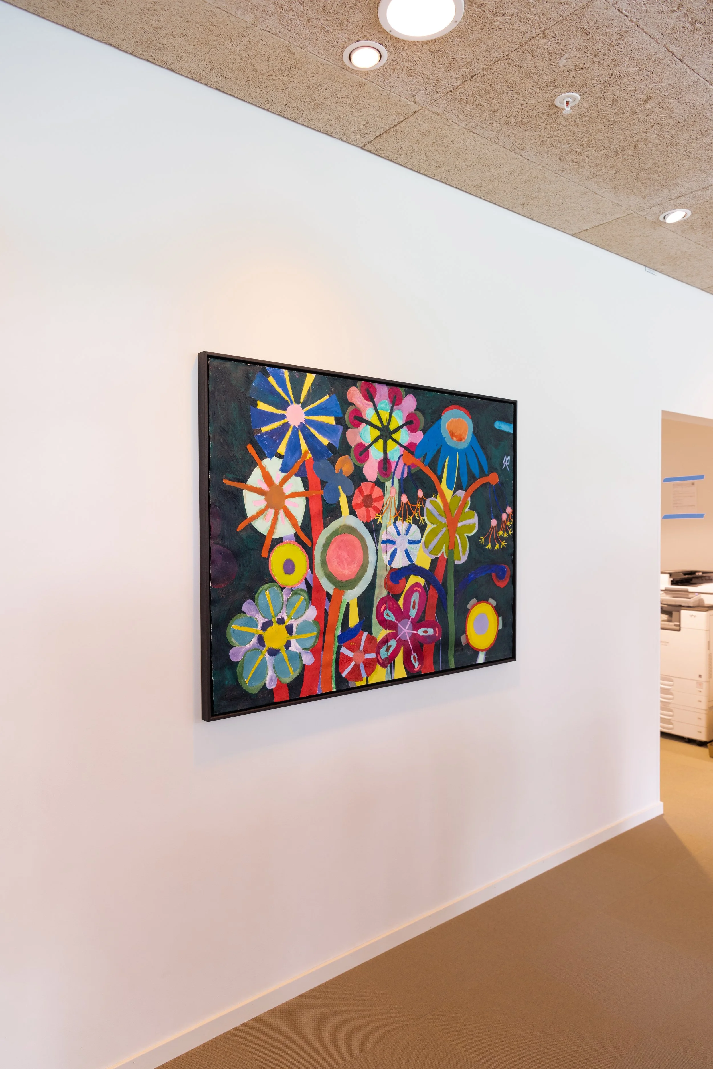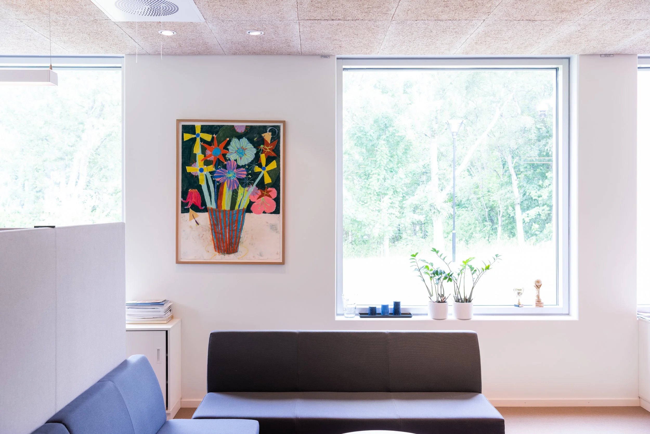 DET STRÅLER EN KRAFT SÅ STERK / ÅS VGS / TRESNITT INNRAMMET MED AVSTANDSLIST MONTERT PÅ AKRYLMALT VEGGFLATE DIREKTE PÅ VEGG / FEM ARBEIDER I HELSEFAG SIN GANG OG ET I FELLES KANTINE / KUNSTKONSULENT MARIANNE DARLÈN SOLHAUGSTRAND